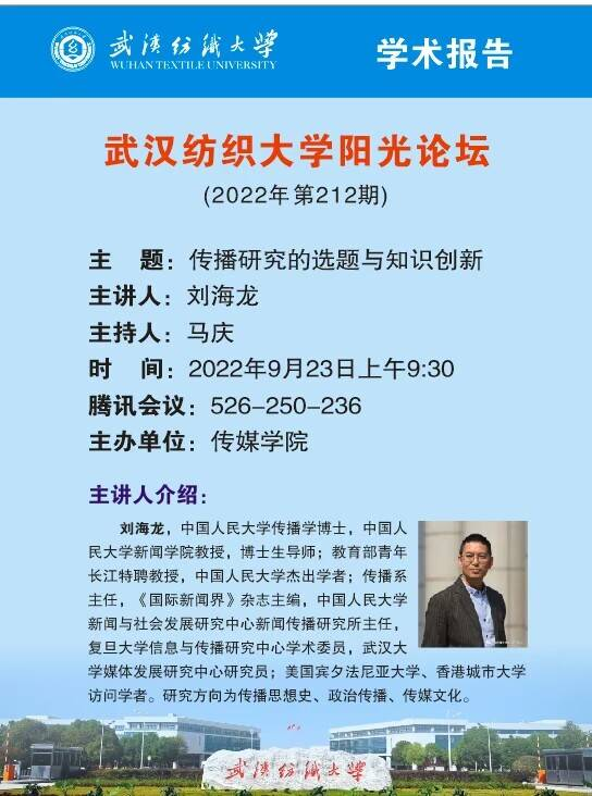 9月23日上午9:30,教育部青年特聘教授、中国人民大学新闻学院教授、博士生导师、《国际新闻界》杂志主编刘海龙准点作客伟德国际1946bv官网,在腾讯云端以《传播研究的选题与知识创新》为题,给学院青年教师、研究生及部分本科生共100多人作了一场精彩的学术分享。两个半小时的讲座,刘教授以学者和主编的双重视角,畅谈研究选题与知识创新的关系,讲述中引经据典、妙语迭出。在提问讨论环节,互动交流热烈。本次讲座同时也是伟德国际1946bv官网“传播·视觉影响力”学术季第16期活动,马庆副院长主持该论坛。