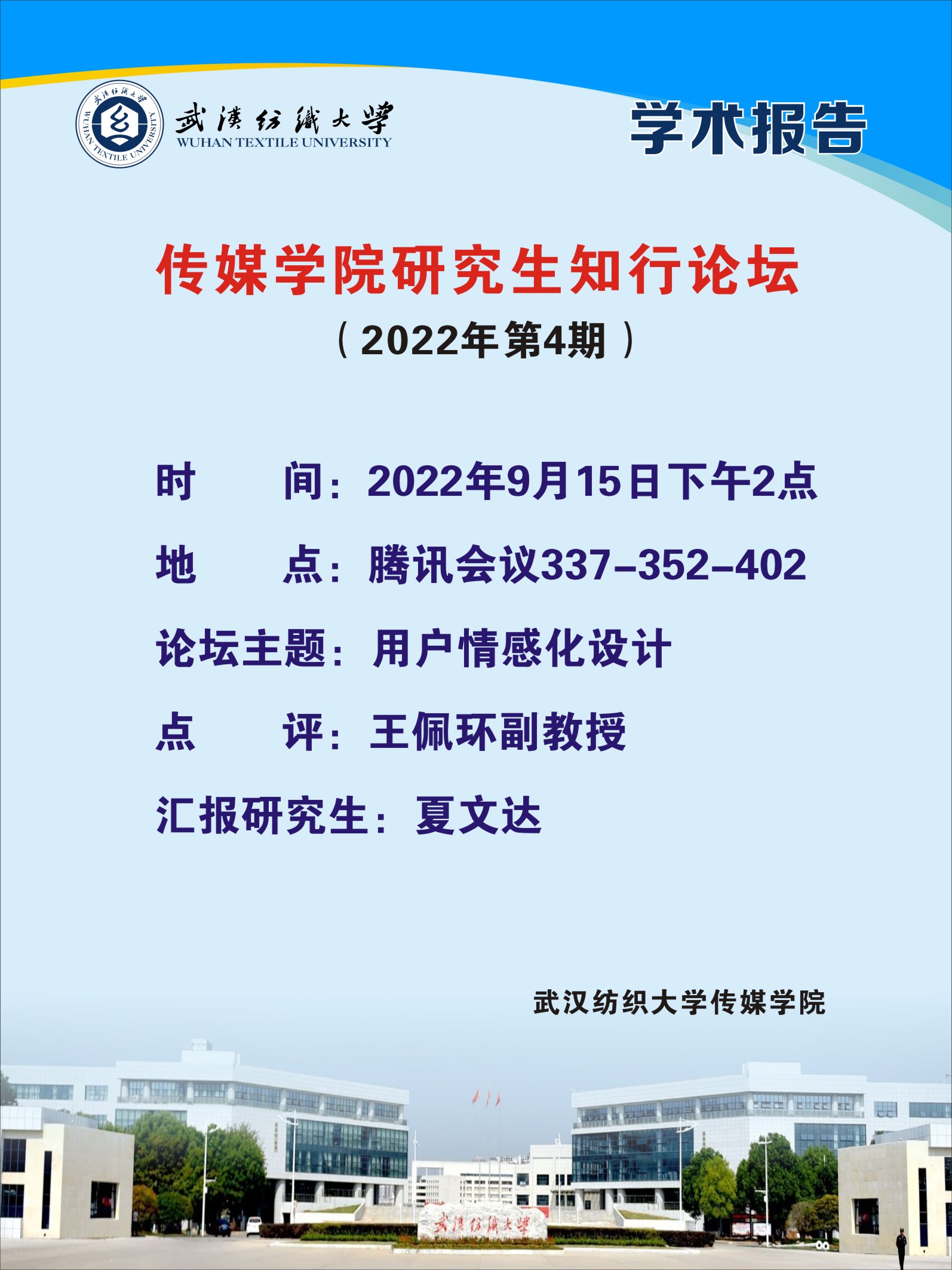 2022年9月15日14:00,伟德国际1946bv官网第四期研究生知行论坛在线上召开。研究生夏文达以《用户情感化设计》为主题进行汇报,王佩环副教授点评。伟德国际1946bv官网研究生积极参加了此次活动。
