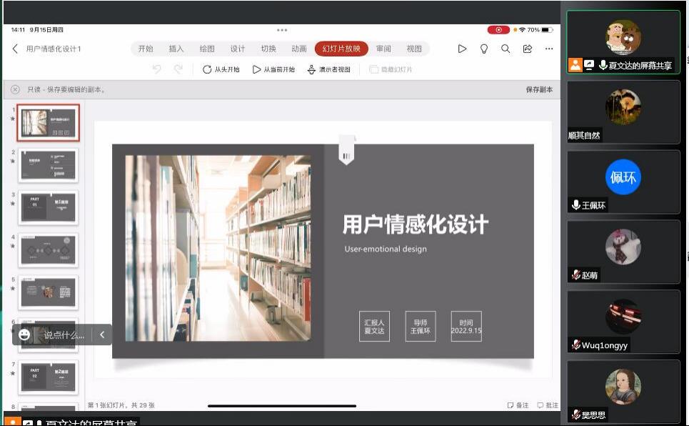 王佩环副教授点评了此次汇报,并从用户情感化设计拓展到动画领域的情感化设计,与线上学生进行了深刻的交流。