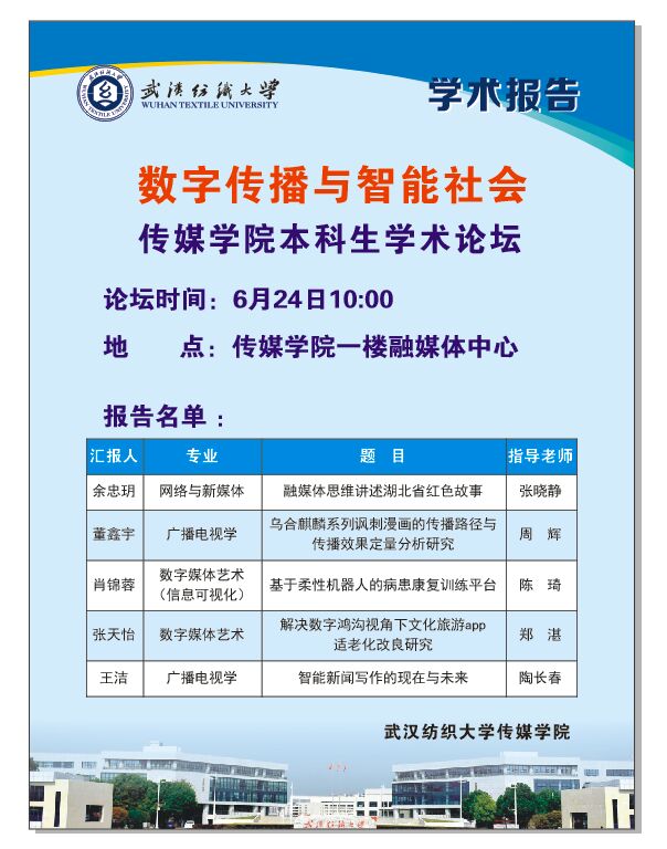此次本科生学术论坛由余忠玥、董鑫宇、肖锦蓉、张天怡、王洁5名学生进行主题汇报。他们从如何用融媒体思维讲述湖北省红色故事;运用大数据信息抓取分析乌合麒麟系列讽刺漫画的传播路径与传播效果;基于柔性机器人的病患康复训练平台;解决文化旅游app适老化改良研究以及“智能化写作的现在与未来”等五个方面分享伟德国际1946bv官网对传播与智能社会的思考。