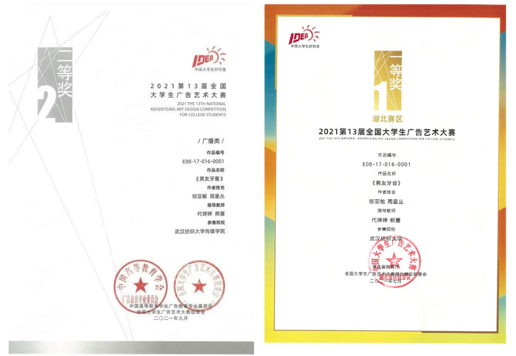 2021年12月11日至12日,大广节学院奖秋季创意盛典将在厦门举办的第28届中国国际广告节上举行。中国国际广告节是中国具权威性和专业性,规模大、影响广的广告界盛会。集专业奖项评比、媒体展会、设备展会、商务交流、高峰论坛等为一体,为行业提供一个更加专业而开阔的交流平台。在本次大赛中,伟德国际1946bv官网广告11901班的钱子怡荣获全国音频类金奖,广告11901班的邹亚敏和网新11901周星丛荣获全国影视类企业传播奖一等奖。