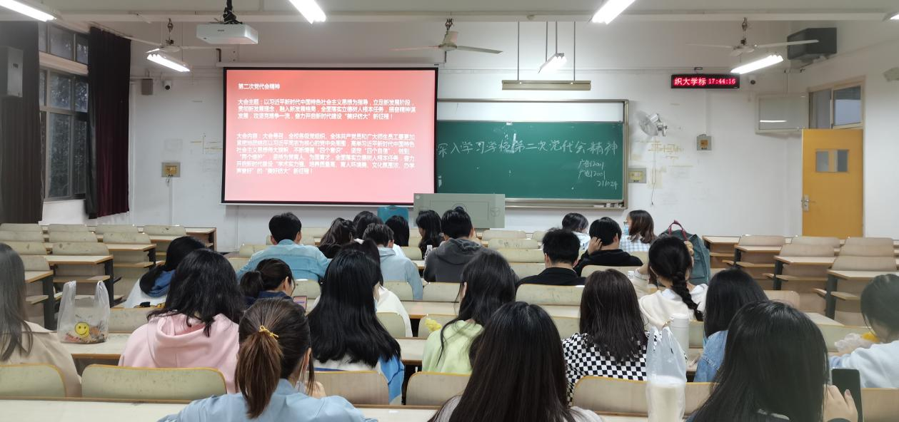 活动伊始,同学全体起立,齐唱中华人民共和国国歌。同学们心情澎湃,内心升腾起无限的自豪。随后,各班团支书带领同学们全面回顾总结了学校第二次党代会以来的显著成绩,形成的经验和存在的不足,阐释了“美好纺大”的基本内涵。通过学习,同学们更加清楚地认识到美好纺大的内在涵义,充分认识了党代会的重大意义。