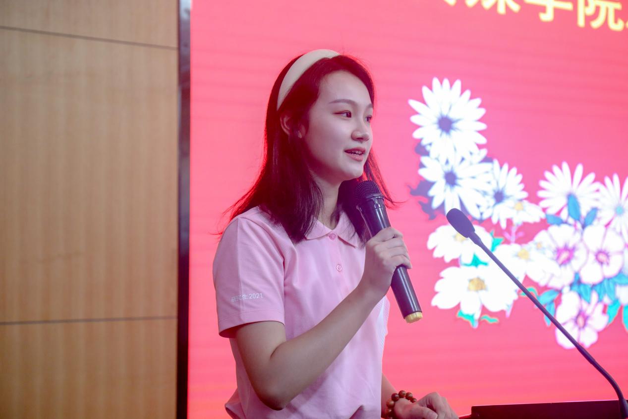 2021级新生代表卓芯羽同学表达了对求学之路的回顾和对纺大新征程的展望,她谨代表全体新生向学院庄严承诺:刻苦学习、自强不息;严格按照学校、学院的各项规章制度的要求,尊师重教、团结奋进;积极配合学院的各项人才培养计划,树立远大的理想,做德才兼备、勇担重任、有务实精神的理想主义者。最后表达了对老师和同学们的诚挚祝福。