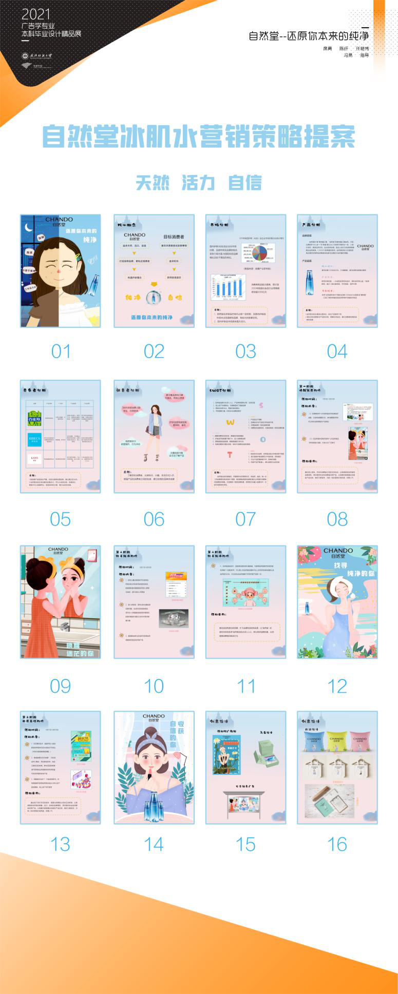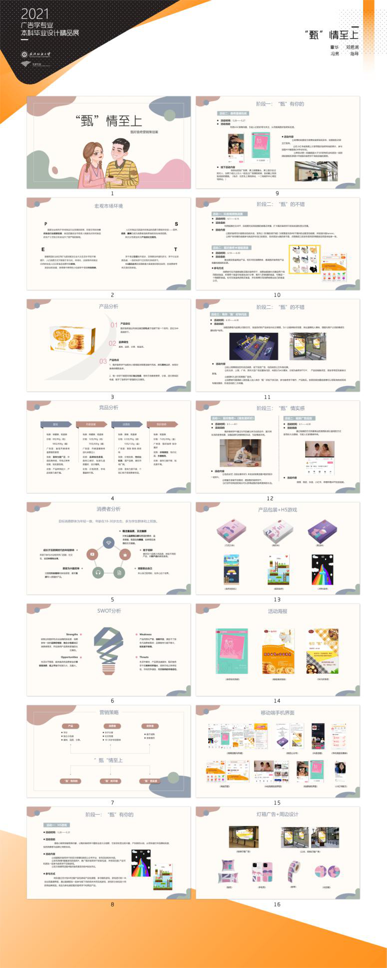 毕业设计内容包含两个板块,论文答辩已经圆满结束,而丰富的毕业设计作品展于6月6日-6月20号在伟德国际1946bv官网融媒体实训中心开展,展品选题来源于企业真实命题,营销策略贴合市场流行趋势和企业需求,将各类产品以年轻、时尚、有趣、潮流的创意形式传播给消费者。创作题材丰富多样,创意别出心裁,专业性强。