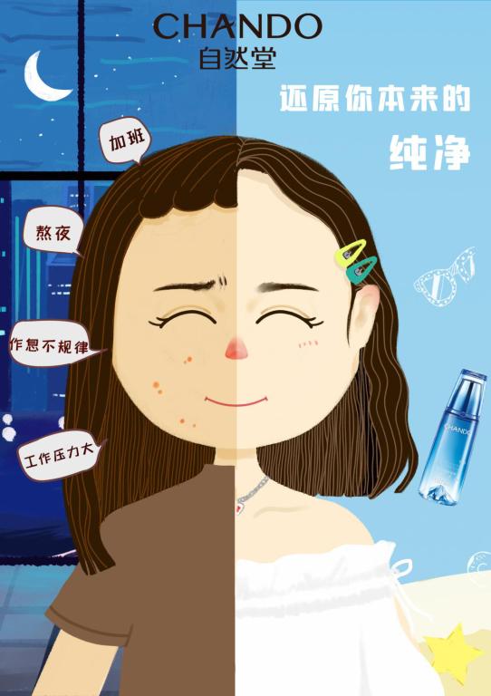自然堂组的策划主题为“还原你本来的纯净”,将自然堂追求天然、活力、自信的品牌定位和目标消费者喜欢并愿意尝试新鲜事物、追求时尚相结合,传递了护肤理念和自信姿态,该策划案先在微博和抖音打响热度,“唤醒”迷茫的自己,利用线下体验馆和音乐节,将“纯净”和“自信”相链接。每个阶段都有象征不同状态消费者的动漫海报和自然堂冰肌水动态视频作品,生动有趣地将“还原你本来的纯净”自然堂冰肌水品牌魅力深入人心。