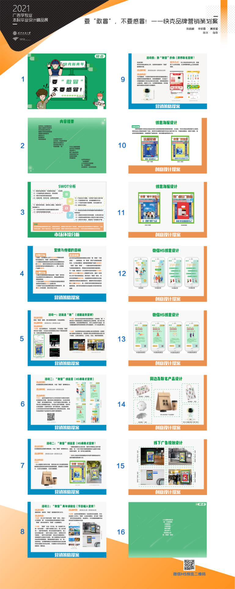 快克组的“要‘敢冒’ 不要感冒!”,利用谐音,将“敢冒”理念与感冒病症相结合,让目标消费者一眼就能够明确产品的功能属性“感冒”谐音“敢冒”,该策划案利用微博抖音话题造势、H5病毒式传播、跨界联名等活动形式,一方面突出快克感冒药敢于与感冒病毒相抗争,帮助受众恢复健康的功能属性,另一方面,展现18-30岁的年轻受众群体敢于冒险敢于挑战自我的积极向上的精神与状态。