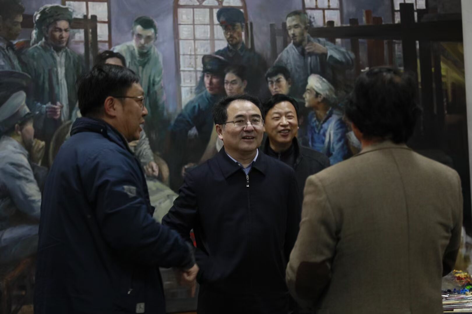 在庆祝建党一百周年湖北省党史重大历史题材油画《火种一一毛泽东创办武昌中央农民运动讲习所》创作室,学院院长沈祥胜向田书记汇报了油画作品《火种》的创作初衷、党史内涵和工作进展。学院曾令玉书记向田书记汇报了学院党史学习教育的特色做法以及“青春信仰—百名学生讲百年党史”100集系列短片的活动进展。