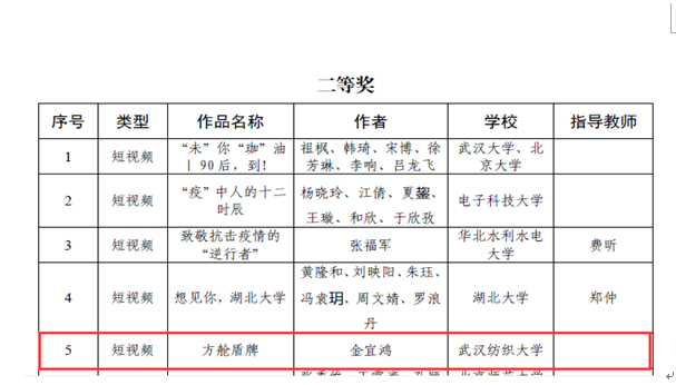 学院师生抗疫作品《方舱盾牌》在教育部“第四届全国大学生网络文化节”和“全国高校网络教育优秀作品推选展示活动”中荣获短视频类二等奖;脱贫攻坚题材网络电影《我和我的村》在湖北省“决战决胜脱贫攻坚,小康路上一个不少”2020年网络视听作品征集活动中荣获“最佳网络电影”;脱贫攻坚纪录片《“非”常懂你,中国》获“优秀纪录片”。