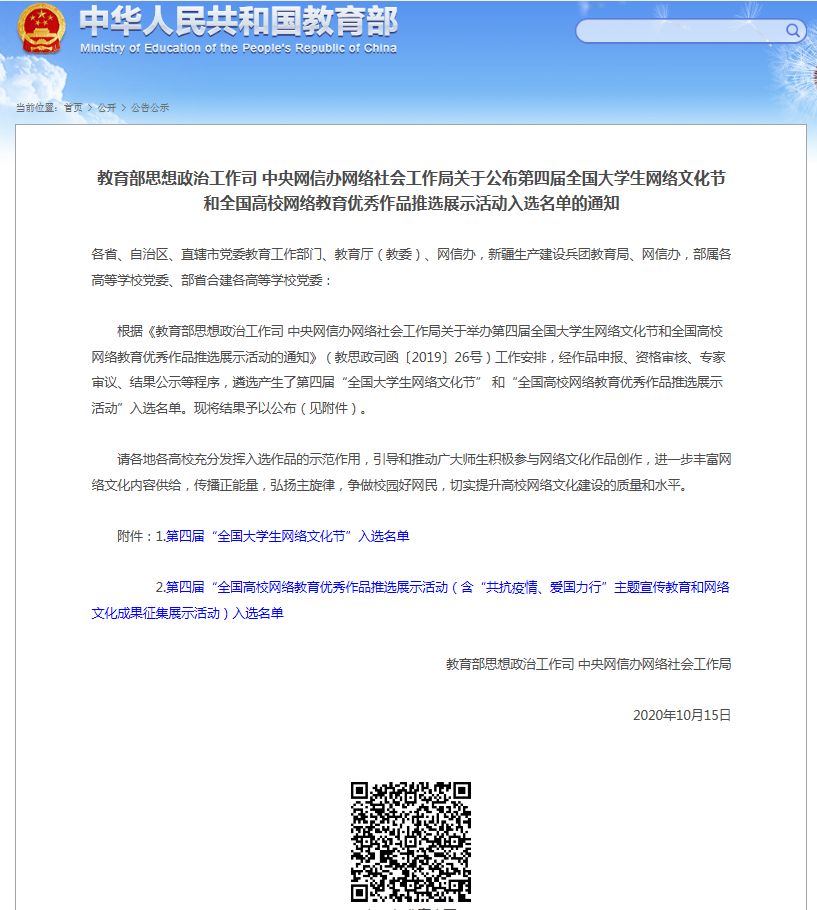 10月15日,教育部公布了“第四届全国大学生网络文化节”和“全国高校网络教育优秀作品推选展示活动”获奖作品名单。经作品申报、资格审核、专家审议、结果公示等程序,伟德bv1946官网伟德国际1946bv官网金宜鸿老师的抗疫作品《方舱盾牌》荣获短视频类二等奖。