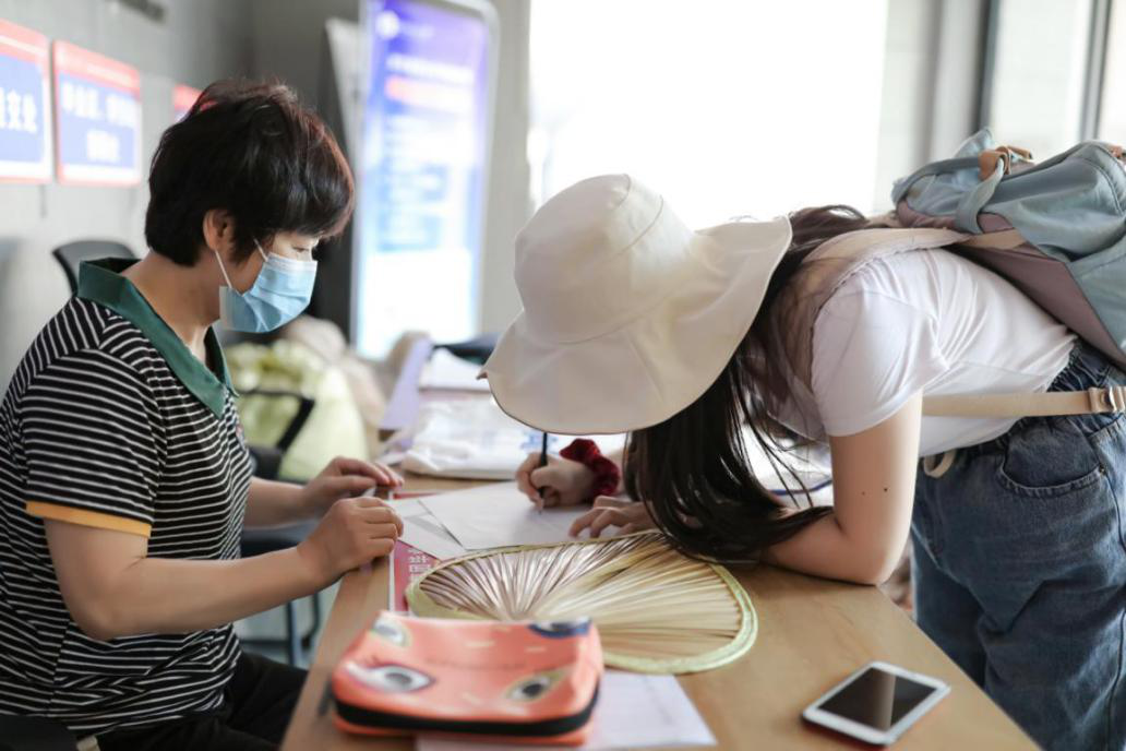 8点30分,来自河南焦作的岳檄文、山东潍坊王睿、武汉的顾紫薇等一批同学返校了,他们有的住到亲戚家今天一早来的,有的坐了一晚上火车,有的父母开车送来的。在学院楼下搭建的一站式服务窗口里,学院教学秘书柳琼花老师仔细盯着每一个来办手续的同学,提醒同学们千万别填写错了。