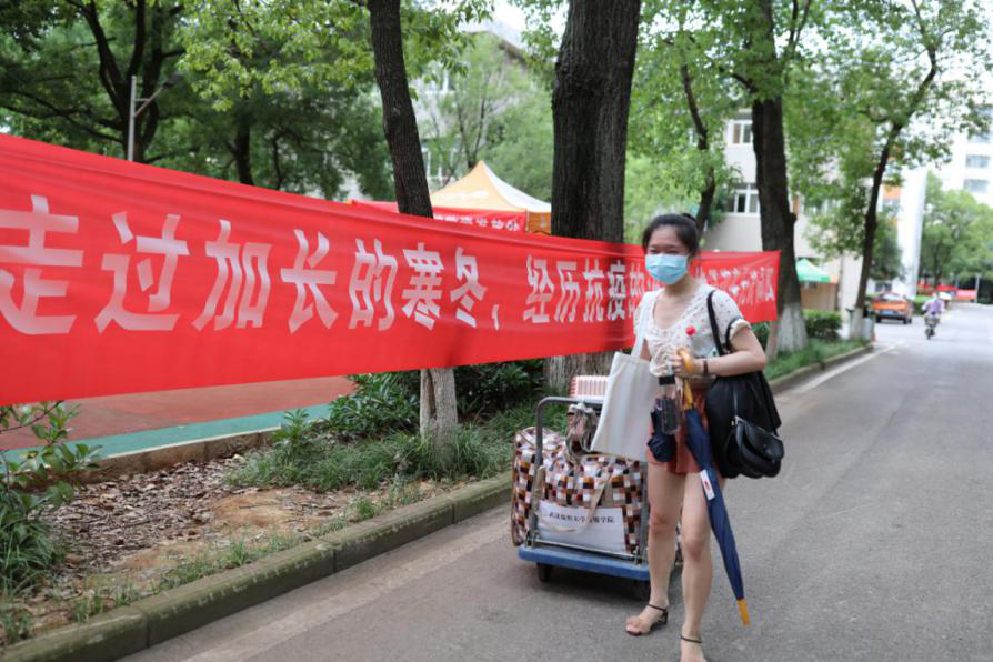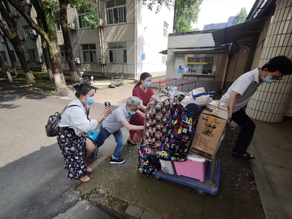 11点30分,6月的武汉气温已经达到34度,忙碌了一上午的老师们终于打包好了行李,肩扛手提的搬去邮寄点邮寄了。老师们的衣服早已被汗湿,但大家都说没事,同学们不能返校,老师们能做一点是一点,希望他们毕业愉快。