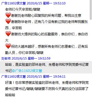 “4栋622宿舍侯文慧同学说物品太多,需要学院志愿者老师帮忙!”毕业班辅导员刘艳丽老师在“伟德国际1946bv官网2020届毕业生返校工作群”发布信息,学院党委书记曾令玉看到了立马在群里回复:“陈华老师、李成新老师、朱煜老师,走,我跟你们一起去!”三位老师立即跑去学生宿舍,你拉我推,帮学生把行李运送出去。侯文慧同学特别感动,跟辅导员留言说一定要好好感谢下学院的老师们,感谢学校提供的贴心服务,表白老师、表白纺大,希望辅导员一定替她转达,此时已经下午16::00多了。