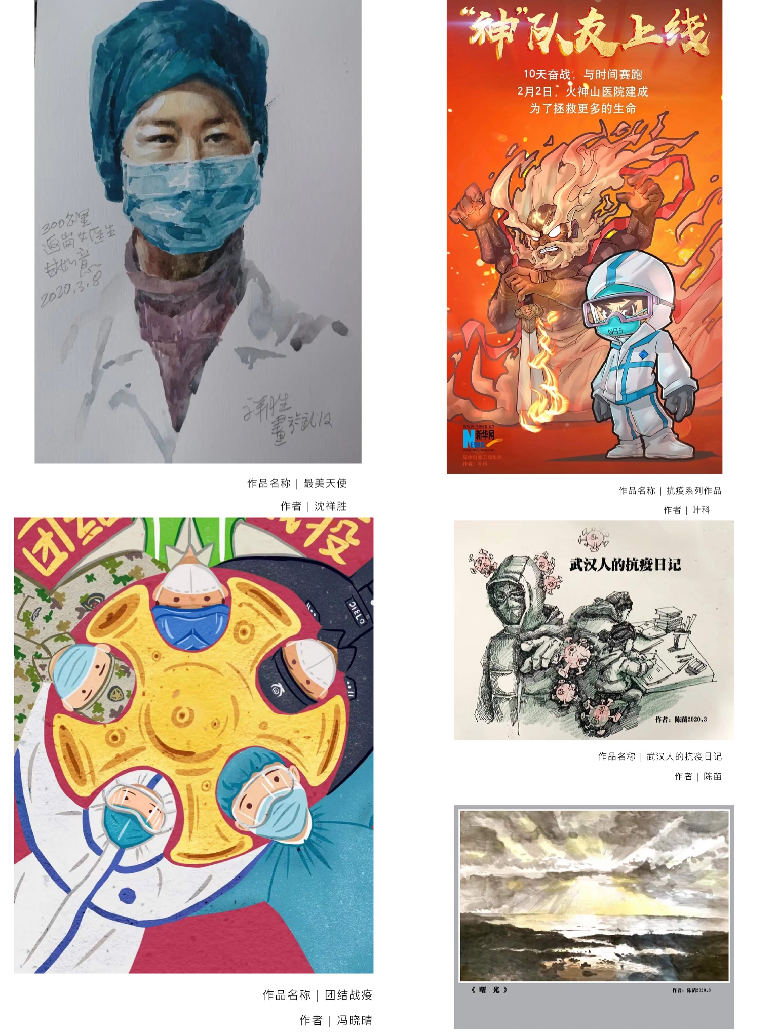院长沈祥胜在看到一名女医生耗时四天三夜,骑行3000公里只为返回武汉抗疫一线,他用画笔记录下这位“最美的天使”;身为武汉人的叶科老师在看到武汉虽然物资短缺,但是所有的一线人员伟大无畏的逆行,国家大力援助和救援,火速建立了火神山和雷神山医院的时候,他拿起画笔记录下来武汉人战役的勇敢精神和战役阶段性成果一幕幕,给武汉加油!;陈苗老师画下了武汉的人的“抗疫日记”;数媒11701班冯晓晴看到医生、护士、警察、工人等等所有人都在为“抗疫”奋战在一线时,她用画笔画下了大家团结一致的样子……