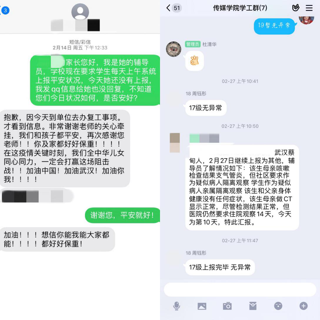 为了实时掌握学院68名教职工和940名学生的健康情况,自1月23日起,全体师生严格执行日报平安制度,学院办公室主任李晓云每日认真做好教职工情况的统计及上报工作,做好各项政策的上传下达,并利用QQ群时时传递防控提示和关怀问候。学院全体辅导员24小时线上在岗,严格贯彻落实学校疫情防控相关部署,认真做好全体学生的身心健康、各类特殊困难等信息的每日统计上报、沟通帮扶等工作。深入各班班务群、学生骨干群,随时传达学校防控工作相关通知精神,耐心解答学生每一个问题,并通过qq,短信,电话等形式向全体师生及学生家长传达疫情防控相关文件精神以及健康状况,引导师生及其家庭正确认识疫情,科学防范疫情。