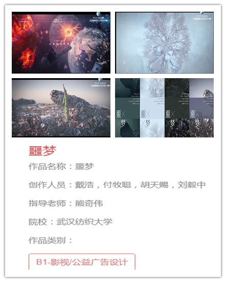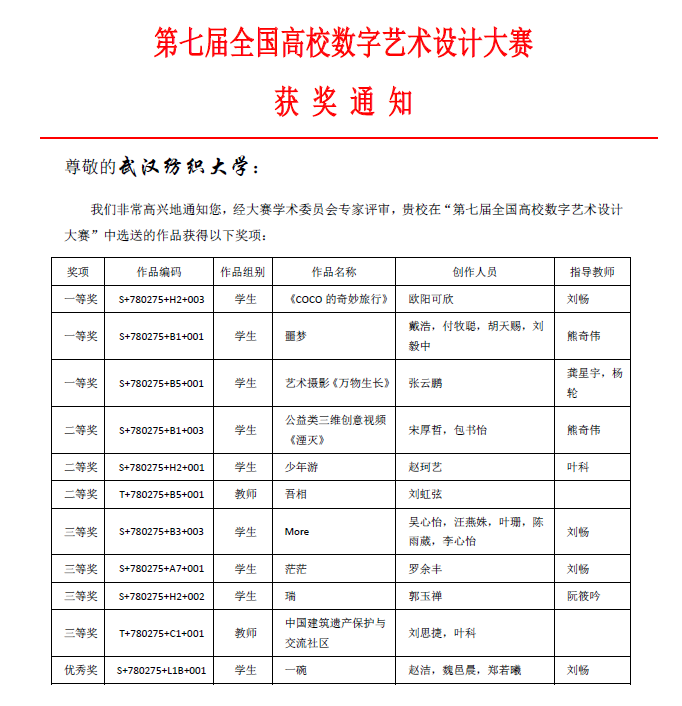 近日由中华人民共和国工业和信息化部人才交流中心主办的“第七届全国高校数字艺术设计大赛”获奖名单公布。伟德国际1946bv官网选送的作品获得优异成绩,有三组脱颖而出,刘畅老师指导的动画专业学生欧阳可欣作品《COCO的奇妙旅行》、龚星宇老师指导的摄影专业学生张云鹏作品《万物生长》、熊奇伟老师指导的数媒专业学生戴浩、付牧聪、胡天赐、刘毅中作品《噩梦》斩获一等奖。