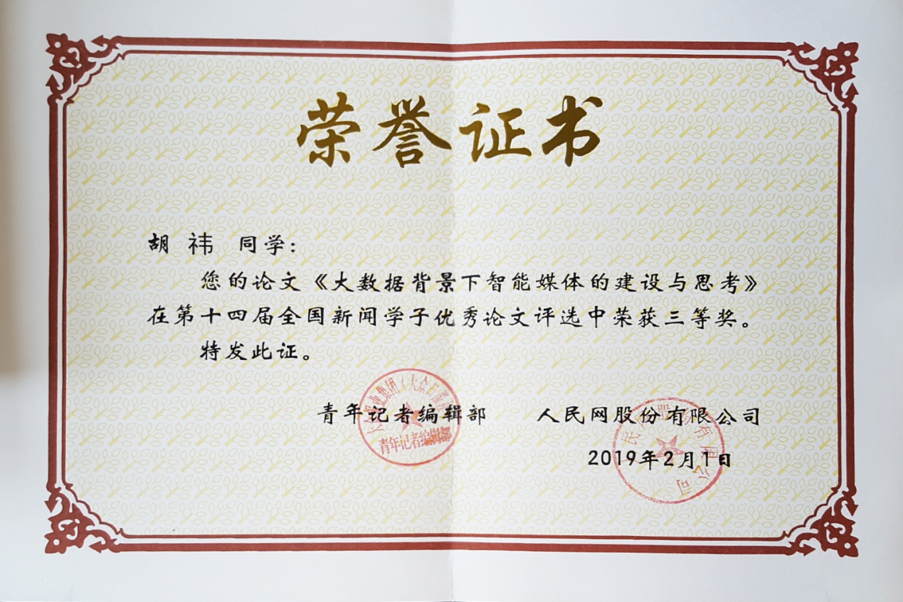 近日,由北大中文核心期刊《青年记者》和人民网传媒频道联合主办的第十四届“全国新闻学子优秀论文评选”揭晓,伟德bv1946官网张晓静老师指导、广播电视专业研究生胡祎撰写的学术论文《大数据背景下智能媒体的建设与思考》荣获三等奖。
