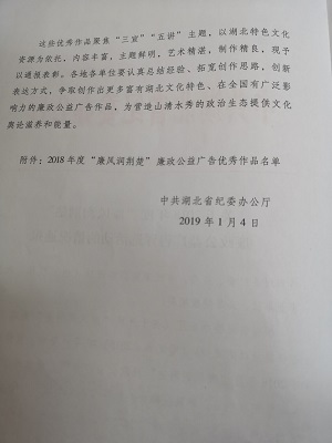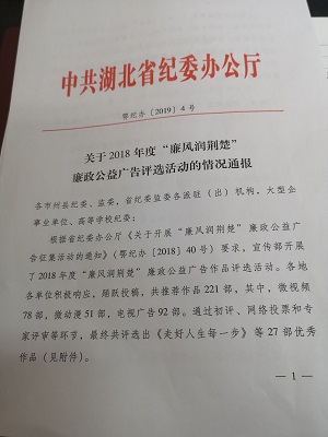 2019年1月4日,中共湖北省委纪委办公厅下文表彰bevictor伟德官网入口推荐作品《点•占》荣获2018年度“廉风润荆楚”廉政公益广告优秀微动漫作品第一名,bevictor伟德官网入口获优秀报送单位。