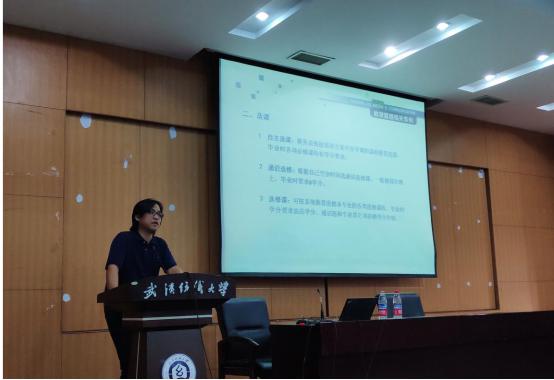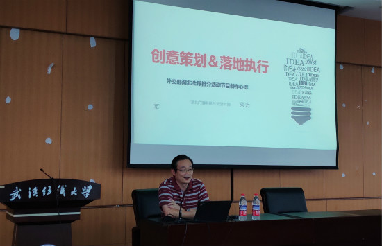 紧接着,湖北广播电视台纪录片部主任、高级记者朱力军先生受邀为传媒新生带来“开学第一课”,他以自己丰富的从业经验为在座新生们带来了新的职业思考。朱主任表示互联网时代是旧媒体与新媒体激烈碰撞的时代,这既是一种机遇也是一种挑战,要抓住机遇,就要学会创造新境界、转变新思想、开拓新格局。随后他以“创意策划&落地执行”为主题,从建立意识、切入项目、主题内容与叙事结构、呈现与表达、产品矩阵与融合传播五个方面分享了外交部湖北全球推介活动节目的制作心得,他还通过《灵秀湖北》《湖北:从长江走向世界》等极具艺术特色的宣传片,进一步诠释了策划创意精巧,落地执行坚决的重要性。最后,朱主任表示策划创意是评判媒体及从业人员水平的重要标准,落地执行同团队、个人的综合素养有关,他还强调了创意策划与落地执行相伴相生:创意策划是落地执行的灵魂,落地执行是创意策划的标准与途径。最后,朱主任对伟德国际1946bv官网未来的专业发展表示期待,并对全体新生送上了真挚祝福。