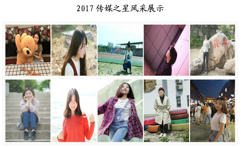 经民主推荐、综合考查和学院研究同意,授予章璠玙(广告11302)、黄茜茜(广电11302)、胡可(广告11302班)、李翔宇(广告11301)、张婷(广告11302)、黄媛媛(数媒11302班)、季宸宇(动画11301)、杨祝青(动画动画21302)、袁腾飞(摄影11301)、张梦瑶(摄影11301)等10名同学第 三届“传媒之星”荣誉称号。