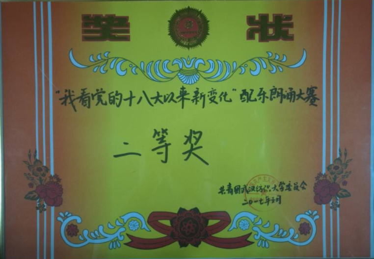 参加学校比赛,获得啦啦操比赛三等奖,党的十八大知识竞赛三等奖,歌颂党的十八大朗诵比赛二等奖,歌颂党的十九大朗诵比赛二等奖。