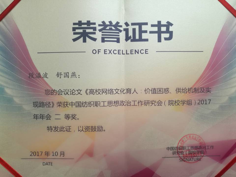 在近日召开的中国纺织职工思想政治工作研究会年会上,学院教师段溢波提交的论文《高校网络文化育人:价值困惑、供给机制及实现路径》,荣获中国纺织职工思想政治工作研究会(院校学组)2017年年会二等奖。