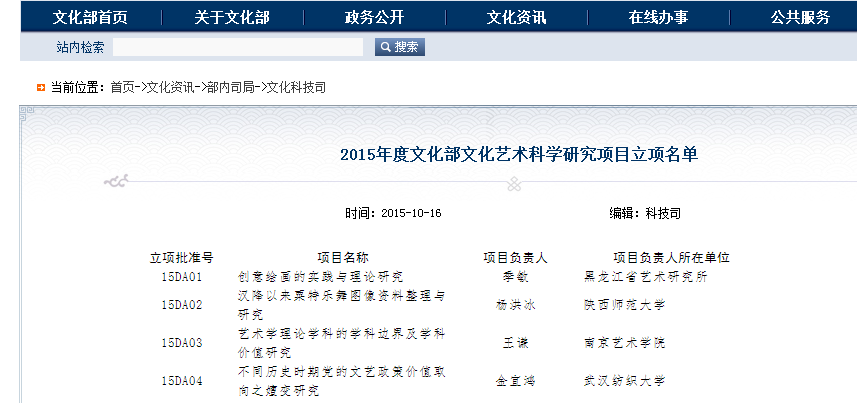 近日,全国艺术科学规划领导小组办公室公布了2015年度文化部文化艺术科学研究项目立项名单,伟德bv1946官网伟德国际1946bv官网金宜鸿副教授申报的《不同历史时期党的文艺政策价值取向之嬗变研究》获批立项(立项批准号15DA04)。金宜鸿副教授长期致力于文艺政策与艺术创作方面的研究和实践,这是其2011年获批教育部人文社科项目立项后再次获得全国艺术学科项目的立项。