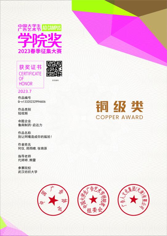 7月19日,中国大学生广告艺术节学院奖(以下简称学院奖、大广节学院奖)2023春季赛颁奖盛典在北京广播大厦隆重举行。本次比赛中,面对来自全国超千所高校的竞争选手、20多万件创意参赛作品的角逐,由伟德bv1946官网伟德国际1946bv官网代婷婷、熊蕾老师指导,何仪,郑雨晴,张锦原同学的短视频参赛作品《别让阿嚏造成你的尴尬!》荣获该项赛事的全国铜奖。指导教师代婷婷被大赛组委会授予“铜级类指导教师”的荣誉称号。