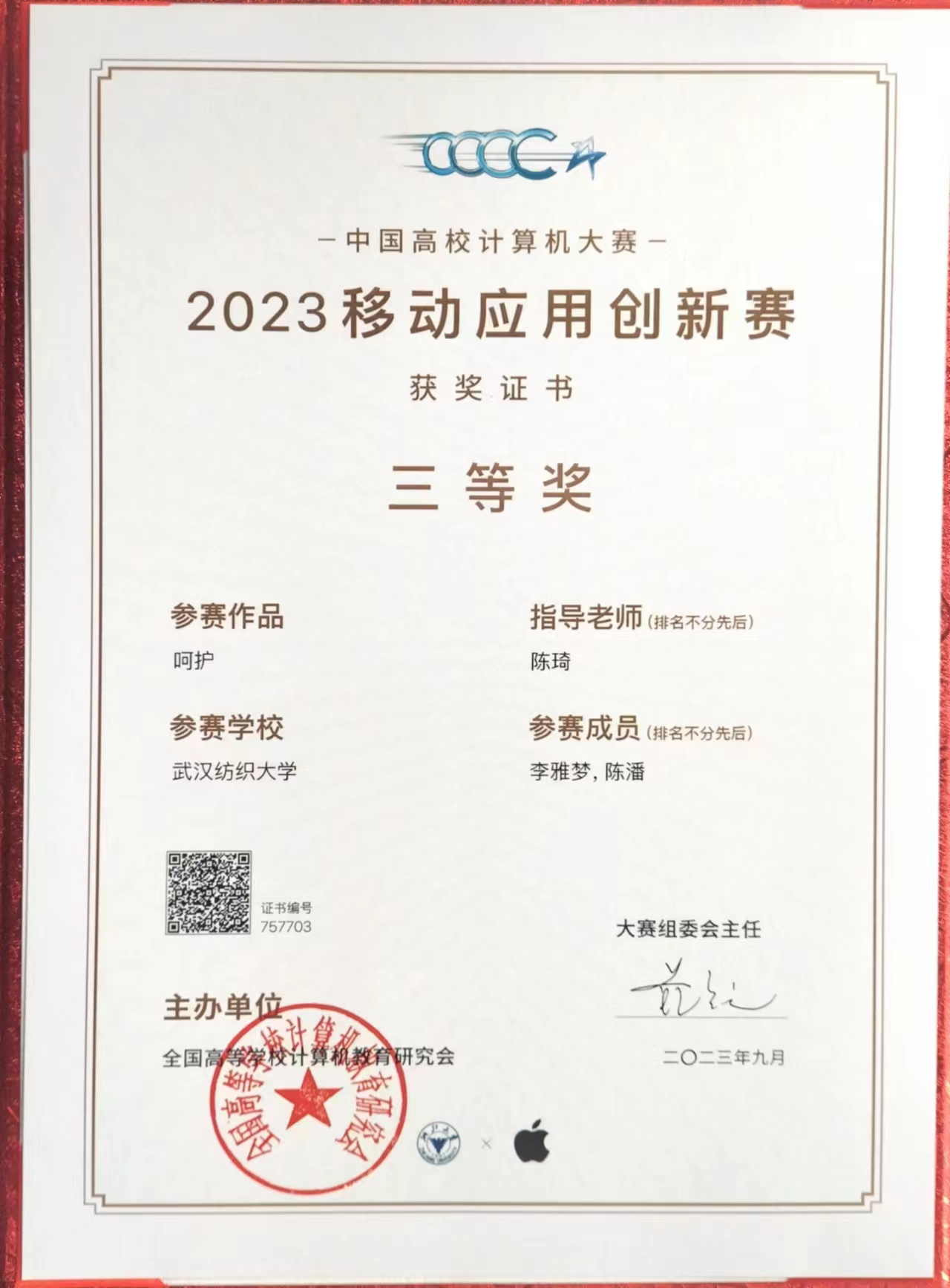 9月3日,2023年度第八届中国高校计算机大赛总决赛在浙江大学举行,伟德国际1946bv官网2021级数字媒体艺术专业学生李雅梦、陈潘在移动应用创新赛中荣获全国三等奖。