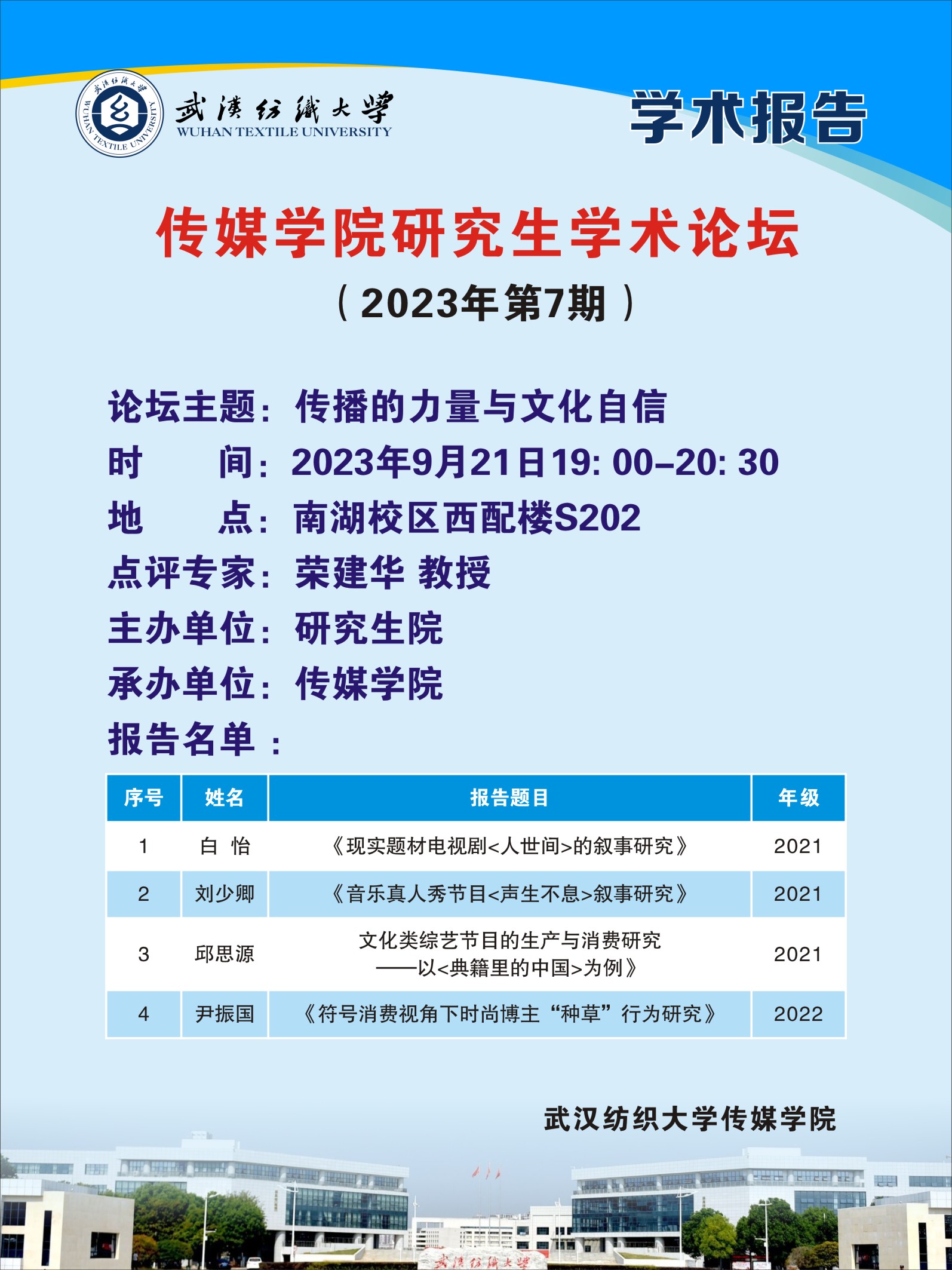 9月21日晚,伟德国际1946bv官网举办主题为“传播的力量与文化自信”的研究生学术论坛。来自2021级广播电视专业的白怡、刘少卿、邱思源和2022级新闻与传播专业的尹振国4位同学分享各自的研究工作。论坛由荣建华教授主持,伟德国际1946bv官网视觉艺术与新媒体团队及相关研究生参与此次论坛。
