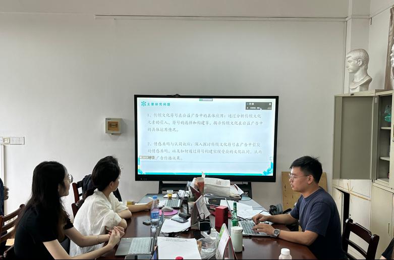 会上,针对传播学领域普遍关注的问题,研究生们从当前研究的视角、方法、主要结论、研究趋势等方面进行了总结阐述。刘勇同学关注到传统文化在公益广告视频中的体现,通过分析传统文化元素的引入、符号的选择和构建等,揭示传统文化在公益广告中的具体运用情况,深入探讨传统文化符号在广告中引发的情感共鸣,以及如何通过符号构建实现受众的文化认同。