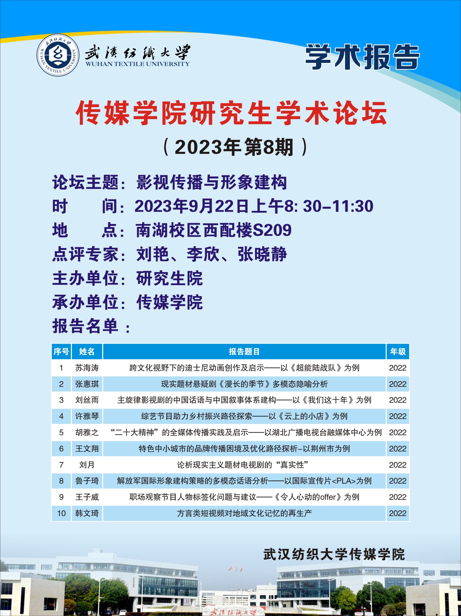 为促进学术交流,提高学术水平,研究生提供一个展示自己研究成果的平台,9月22日上午,伟德国际1946bv官网2023年第8期研究生学术论坛顺利举行。此次论坛的主题为“影视传播与形象构建”,伟德国际1946bv官网副教授刘艳、李欣和张晓静三位老师出席本次论坛,22级10名硕士研究生在会场进行主题汇报,部分23级新闻与传播专业、广播电视艺术专业研究生参会。