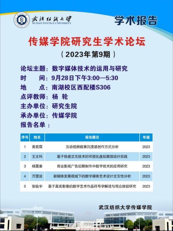 2023年9月28日下午3时,伟德国际1946bv官网在西配楼S306室举行第9期研究生学术论坛。5名硕士研究生围绕数字媒体技术的应用研究进行主题汇报,硕士生导师杨轮主持此次学术论坛,并给予了精彩的学术点评,伟德国际1946bv官网部分2023级硕士研究生参加活动。