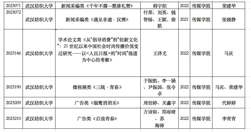 经过严格评审和激烈角逐,伟德国际1946bv官网师生作品从全省43所本专科高校571项大学生新闻传播教育创新实践技能竞赛作品中脱颖而出,荣获多项大奖。学生韩宇阳的作品《千年不腐——楚漆礼赞》 和付荣、刘英、钱智旸、王颖,徐航五位同学的作品《遇见非遗·汉绣》获新闻采编类二等奖;王泽尤的作品《从“倡导消费”到“创新文化”:21 世纪以来中国社会时尚传播价值变迁研究——以<人民日报>的“时尚”报道为中心的考察》获学术论文类二等奖;于振凯、李一涵、尹振国、张令卓四位同学的作品《三线·青春》获微视频类三等奖,周怡婷、关鑫宇的作品《银鹭消消乐》和方诗如、郑雨晴、苏海涛三位同学的作品《后浪青春》获广告类三等奖。
