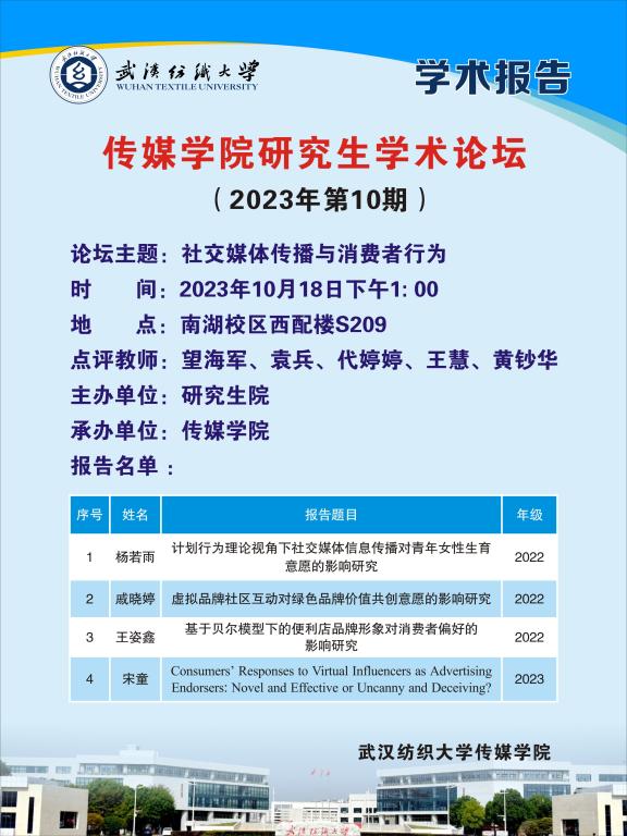 10月18日下午,伟德国际1946bv官网在南湖校区西配楼S209举办2023年第10期研究生学术论坛。本次论坛以“社交媒体传播与消费者行为”为主题,邀请望海军、袁兵、代婷婷、王慧、黄钞华五位老师担任点评专家,社交媒体融合创新研究团队全体在校研究生参加。