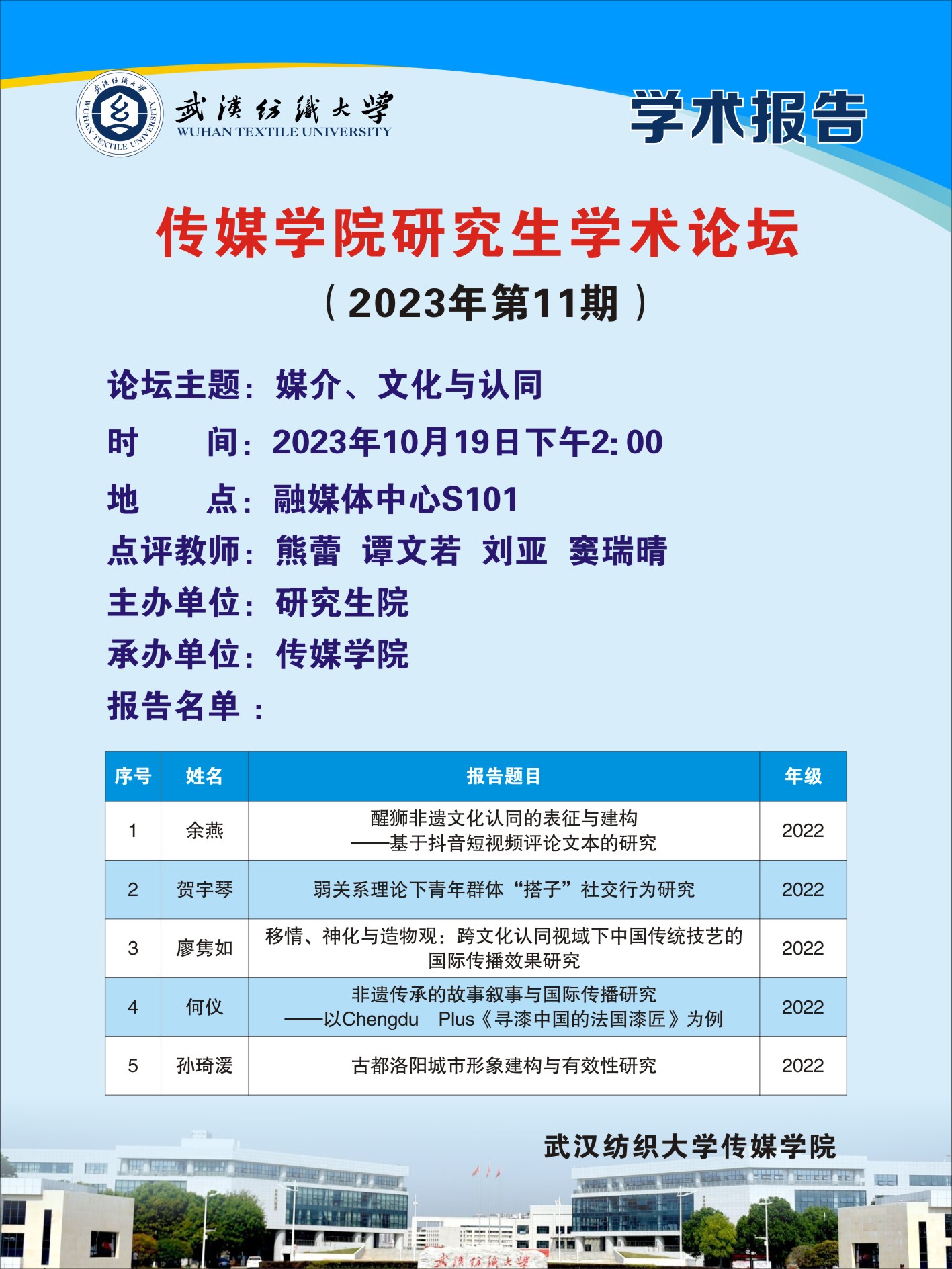 本次论坛的主题是“媒介、文化与认同”,余燕、贺宇琴、廖隽如、何仪、孙琦湲五位研究生围绕中华传统文化的媒介建构、国际传播与青年文化认同等问题依次进行汇报。老师们对学生的选题前沿性和理论可行性表示肯定,并从研究主体价值性、理论框架严谨性、学科领域聚焦性和后续研究方向等方面提出了宝贵的意见。