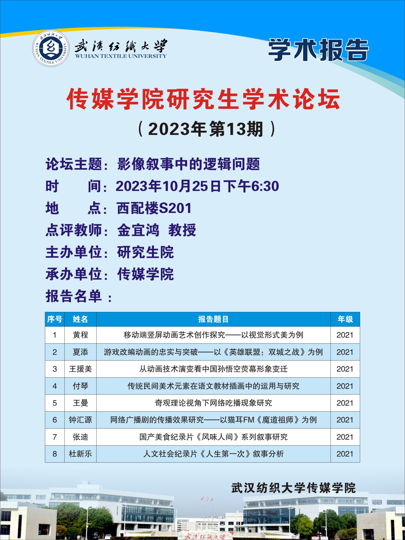 论坛开始后,8名研究生分享各自研究的选题、研究论文进展、研究成果及感悟。付琴以《传统民间美术元素在语文教材插画中的运用与研究》为题,从语文教材的插画中探究传统民间美术元素的运用现状并进一步提出相关建议;王援美选择孙悟空人物形象从发展的角度去看待动画创作发展中技术与艺术体现对动画作品内涵的升华,期望发掘中国动画发展过程中的矛盾;张迪通过对国产美食纪录片《风味人间》系列进行叙事研究,为纪录片的研究发展提供新的视角。