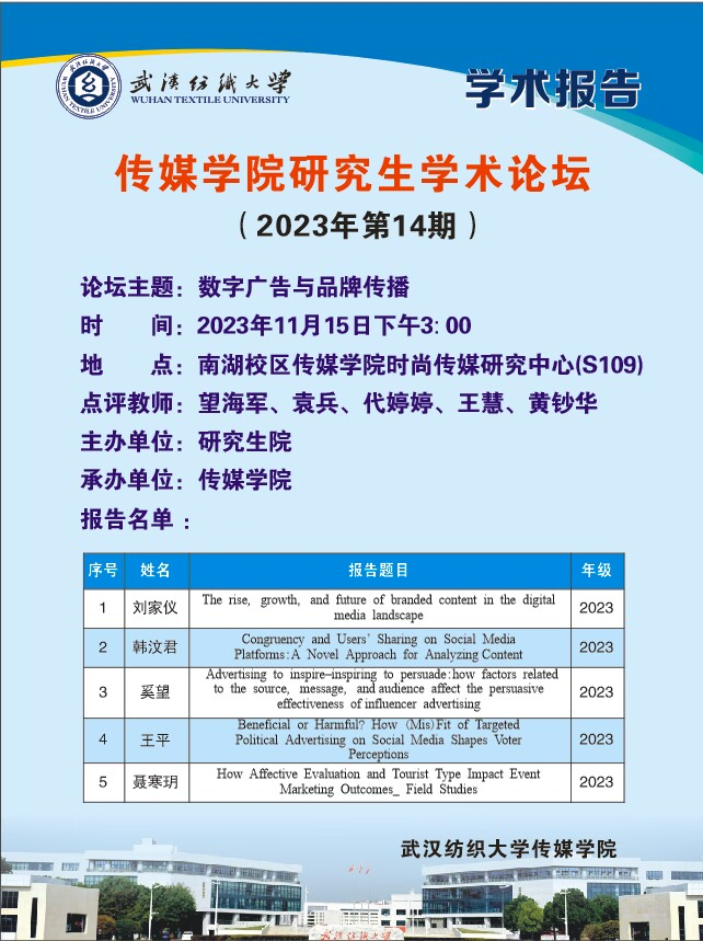 为了持续调动师生科研积极性,促进学生间的相互交流,加强师生沟通,11月15日下午3时,伟德国际1946bv官网2023年第14期研究生学术论坛顺利举行。此次论坛的主题为“数字广告与品牌传播”,伟德国际1946bv官网代婷婷、袁兵、王慧、黄钞华等广告专业老师出席本次论坛,23级4名广播电视专业的硕士研究生在会场就最近学习成果进行主题汇报。