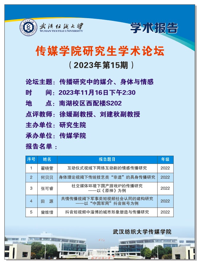 11月16日下午2:30,伟德国际1946bv官网举办主题为“传播研究中的媒介、身体与情感”的研究生学术论坛。2022级新闻与传播专业5位硕士研究生分享各自的科研工作及准备情况。论坛由伟德国际1946bv官网硕士生导师徐媛副教授主持,刘建秋副教授进行学术点评。