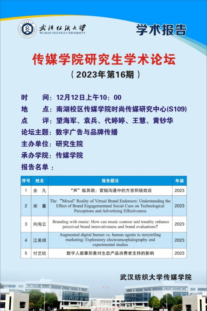 为了持续调动师生科研积极性,促进学生间的相互交流,加强师生沟通,12月12日上午10时,伟德国际1946bv官网2023年第16期研究生学术论坛顺利举行。此次论坛的主题为“数字广告与品牌传播”,时尚传媒量化研究中心2023级5名硕士研究生就最近学习成果进行主题汇报。学院望海军、袁兵、代婷婷、王慧、黄钞华等老师参加学术论坛并进行学术点评。