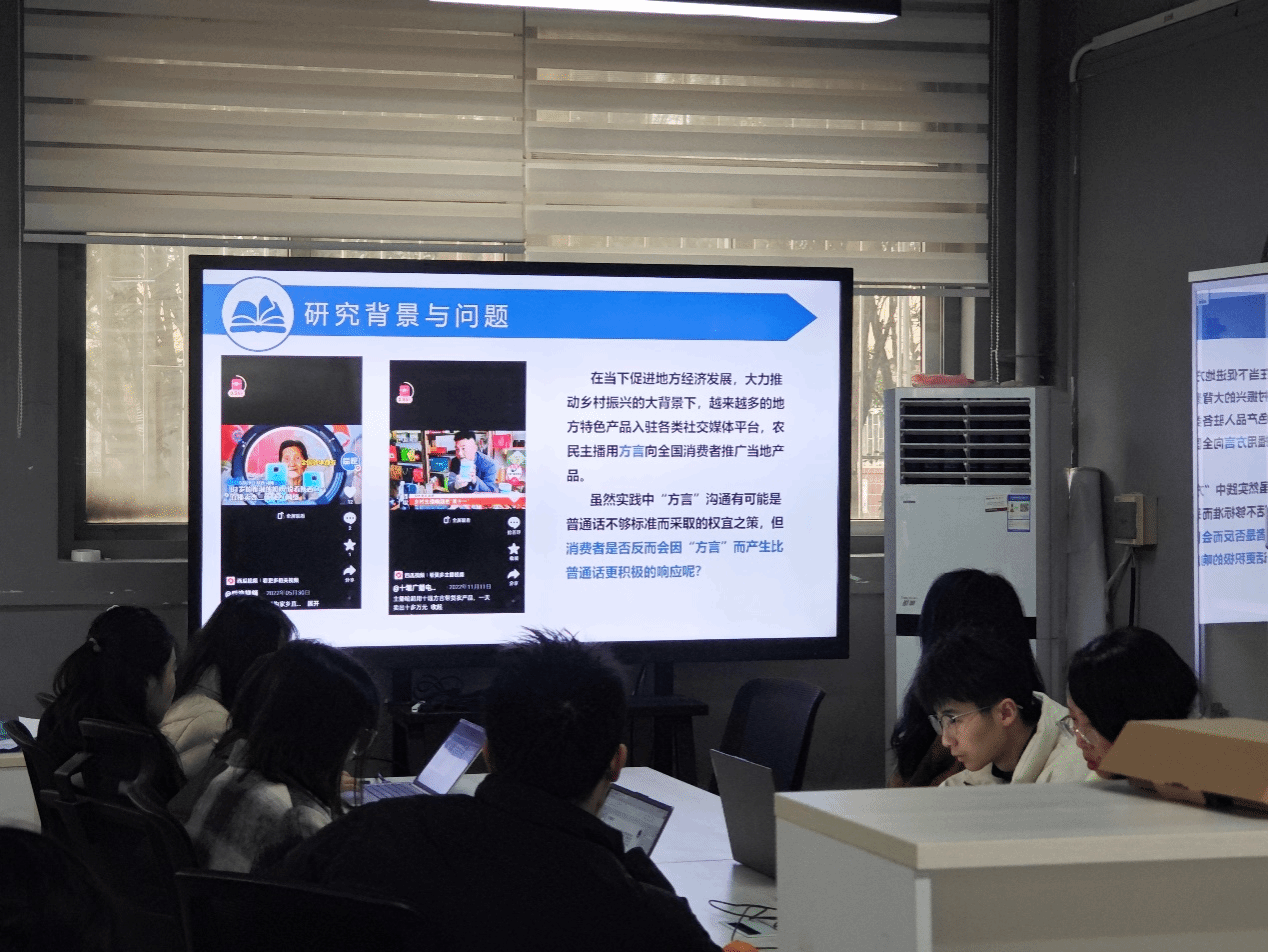 五名同学就自己最近阅读的论文文献,依次展开了汇报。从论文摘要、选题背景、研究方法、研究结论等方面,分享了自己的心得与见解。宋童就社交媒体的现实与虚拟混合探讨了场景对于消费者对VI的感知拟人化和真实性的影响,以及对广告感知和隐性行为的后续影响;余凡探讨了营销沟通中使用方言对消费者购买行为产生的积极影响;江美琪为大家介绍了讲故事营销中使用增强数字人或人类代理对消费者反应的影响,得出当品牌或产品出现在讲故事的广告中时,更高感知的类人数字人类会引起更积极的消费者反应的结论。向海云围绕音乐对品牌认知的影响,探讨了音乐对品牌认知和评价的有利影响和不利影响;付艺欣探讨了数字代言人在老年产品广告中的使用,以及影响背后的中介机制,发现与现实的数字代言人相比,卡通化的数字代言人图像具有更高的解释水平,并导致更高的购买意愿。并且,这种效应是由感知社会价值驱动的。