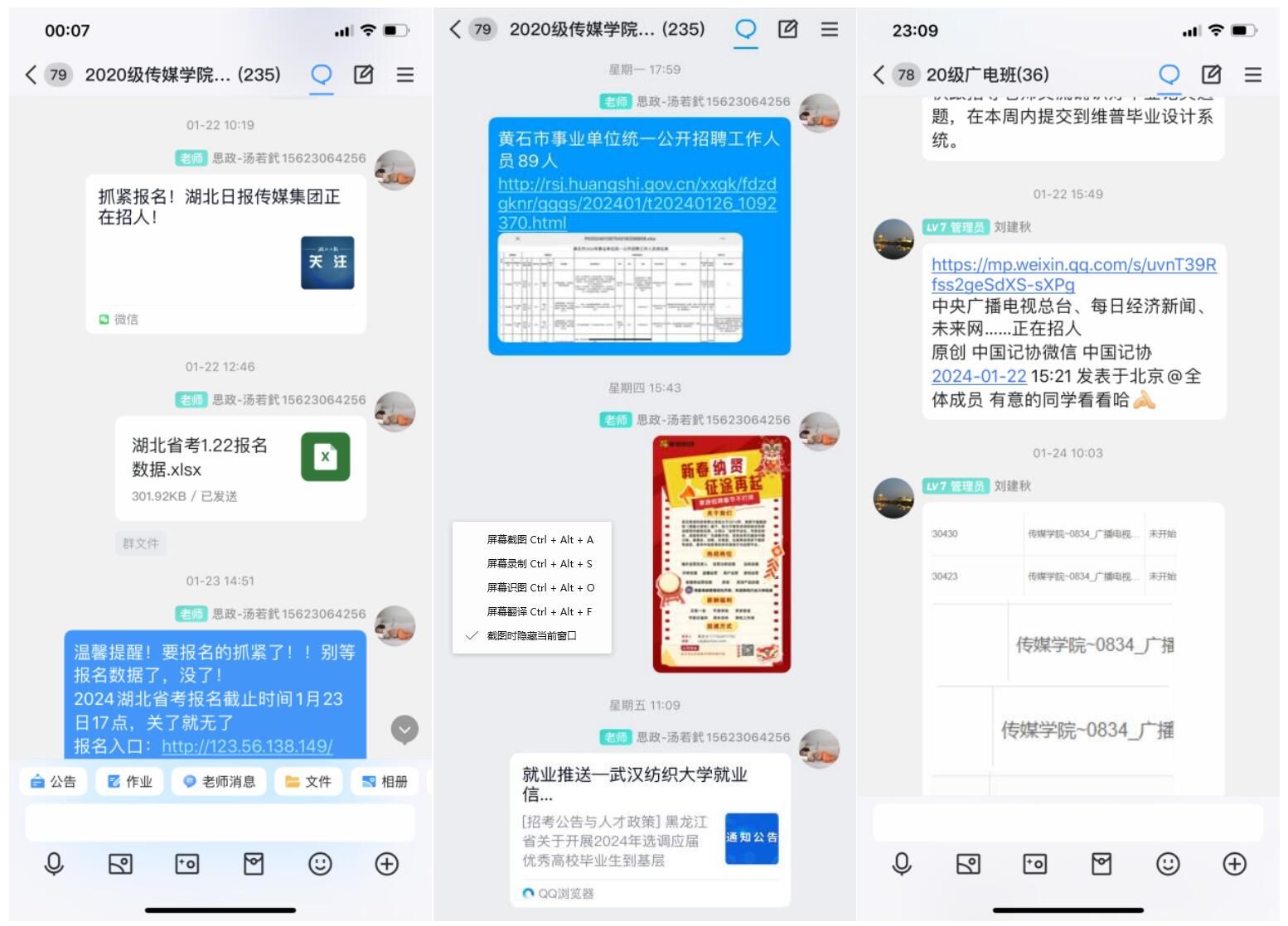 寒假以来,系主任、毕业班辅导员、班主任在毕业生QQ群、微信群等平台先后发布“大湾区科技创新武汉中心管理培训生招聘” “bevictor伟德官网入口2024届毕业生网络双选会(第三场)”“寒假不断线暖心促就业网络招聘活动”“国家大学生就业服务平台-校园招聘”等双选信息,同时收集、筛选各省市公务员招考、企事业单位招聘信息三十余项(条)。