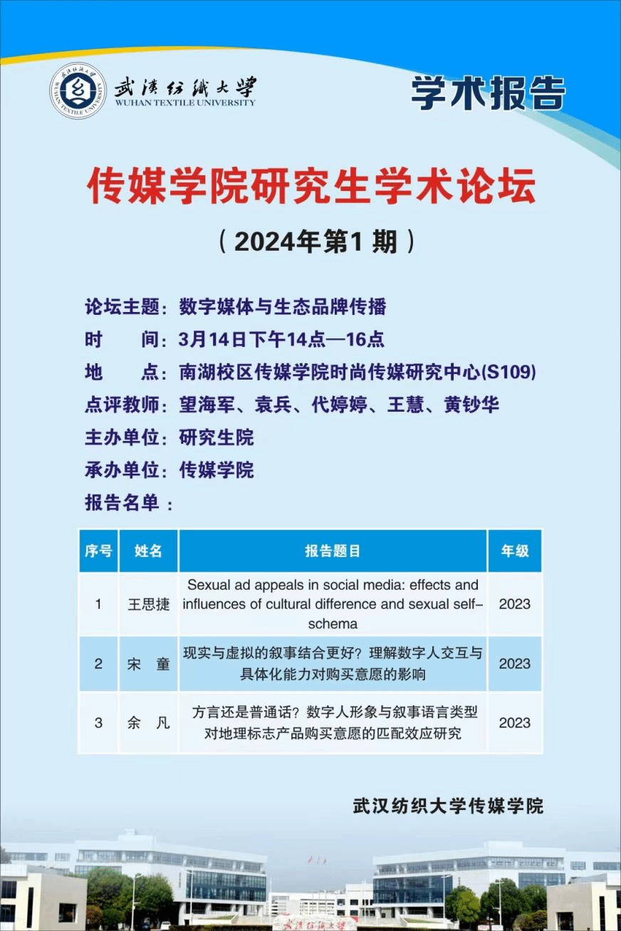 为进一步推动学术研究进展,营造浓厚学术研究氛围,促进研究生的学术交流,3月14日下午14时,伟德国际1946bv官网2024年第1期研究生学术论坛顺利举行。此次论坛的主题为“数字媒体与生态品牌传播”,伟德国际1946bv官网袁兵、代婷婷、王慧、黄钞华等研究生导师参加本次论坛,新闻与传播专业硕士研究生代表就最近学习成果进行主题汇报。
