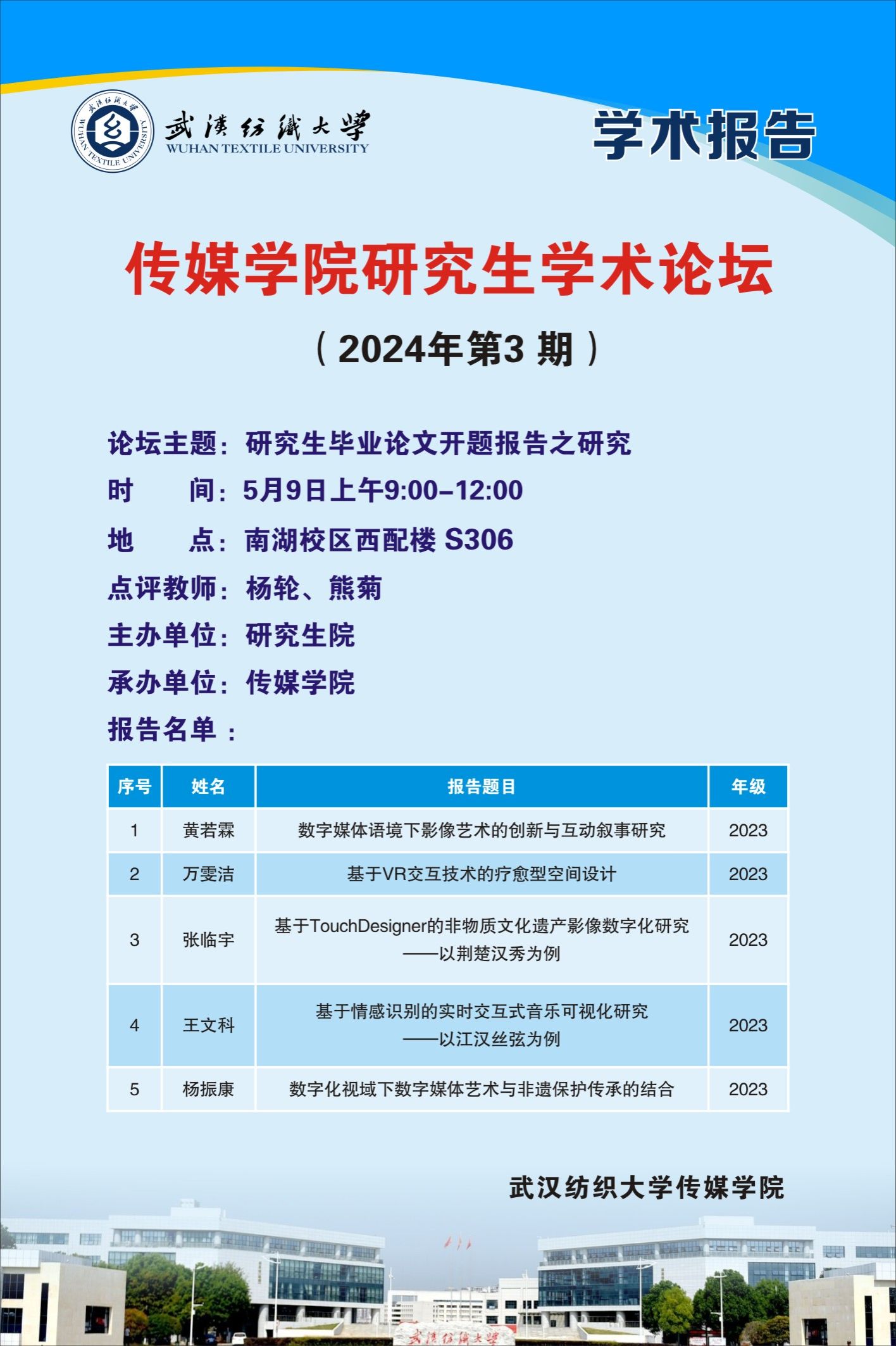 5月9日,伟德国际1946bv官网在南湖校区西经楼S306举行2024年第3期研究生学术论坛,本次论坛以“研究生毕业论文开题报告之研究”为主题,由硕士生导师杨轮主持并进行精彩的学术点评。