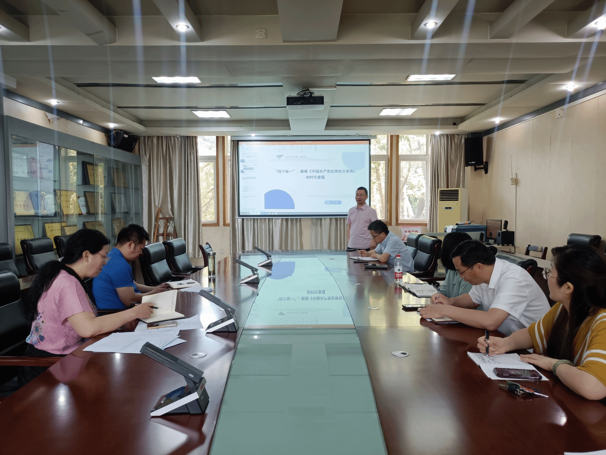 在前期个人自学、集中研学、专题辅导、集中研讨的基础上,纪检委员马庆副院长以“‘四个统一’:新修《中国共产党纪律处分条例》的时代意蕴”为主题,结合自身科研工作领学条例。他从“为什么修订党纪处分条例”“党纪学习教育的根本目标”“党纪学习教育的预期目标”“纪在法前和促进法纪贯通的统一”“紧盯重点问题 和推进全域治理的统一”“党员-科研工作者怎么做”六个方面阐述学习贯彻新修订的《条例》是我们党推进自我革命的重要表现之一,必须深刻领会《条例》修订的重要意义和时代特点,全面理解《条例》的主旨要义和丰富内涵,准确把握《条例》的精神实质和核心理念。高校教师党员应严守政治纪律、组织纪律、廉洁纪律、群众纪律、工作纪律、生活纪律,坚持教书与育人统一,坚持言传与身教统一,坚持潜心问道和关注社会相统一,坚持学术自由与学术规范相统一,为推进强国建设、民族复兴伟业提供坚强纪律保障。