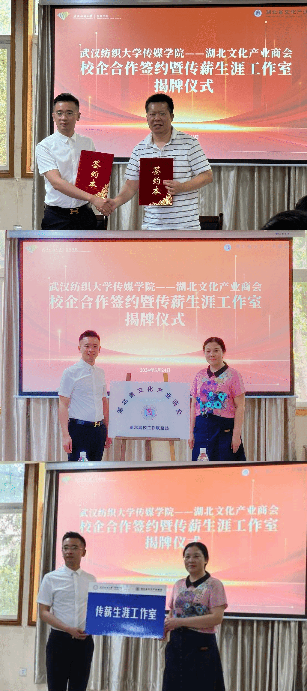 为加强校企合作,深化产教融合,拓宽就业渠道,提升学生就业力与发展力,5月24日,伟德国际1946bv官网与湖北文化产业商会举行校企合作签约暨传薪生涯工作室揭牌仪式。湖北省文化产业商会常务副会长、秘书长栾诚,副会长唐开慧、霍琳,伟德国际1946bv官网党委书记曾令玉,院长望海军等出席仪式。活动由伟德国际1946bv官网学生工作负责人主持。