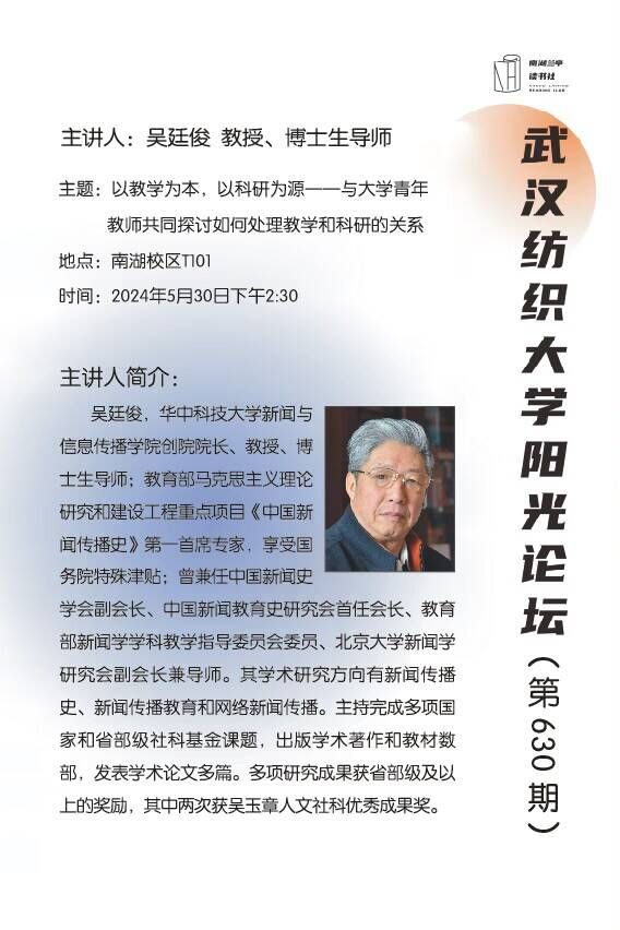 5月30日下午,bevictor伟德官网入口第630期阳光论坛暨伟德国际1946bv官网第4期“南湖·兰亭读书社”在南湖校区尚美楼T101室成功举行。华中科技大学新闻与信息传播学院创院院长、博士生导师吴廷俊教授受邀出席此次论坛,为与会师生带来了一场发人深省的学术讲座。吴教授结合自身丰富的教学和科研经验,以其渊博的学识、独到的见解和生动的案例,为伟德国际1946bv官网师生提供了宝贵的指导和启示。伟德国际1946bv官网领导班子、全体教职工及硕士研究生、本科生代表参加论坛活动。