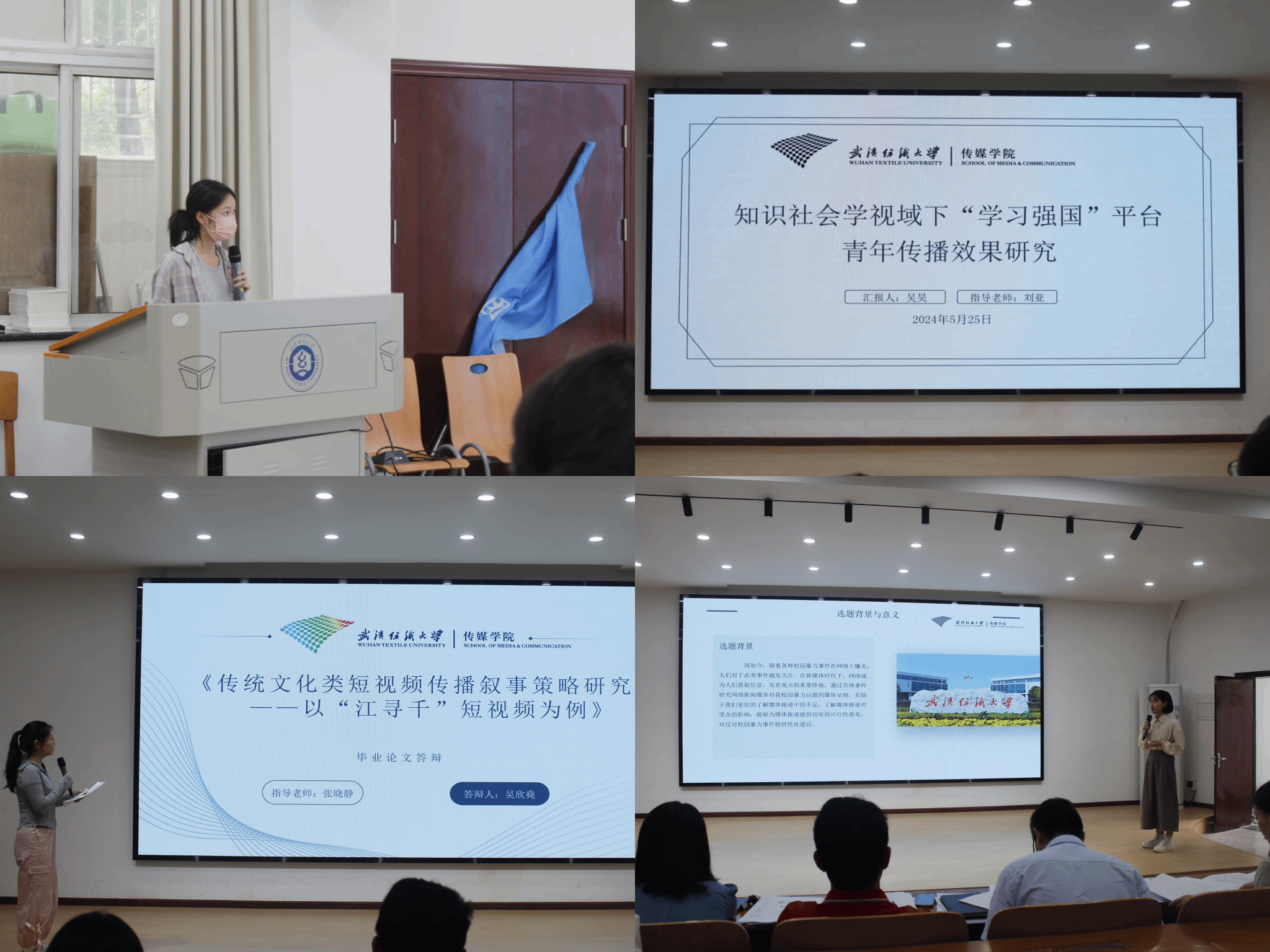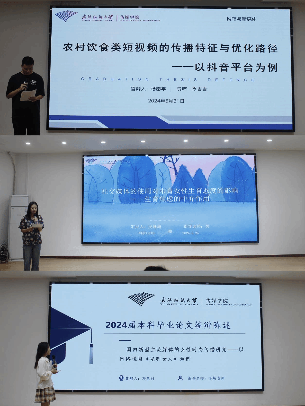 网新12001班杨秦宇的研究方向是农村饮食类短视频的传播特征与优化路径,实现趣味性与地域特色的融合;网新12001班邓星利以网络栏目《光明女人》为例,研究国内主流媒体的女性时尚传播;网新12001班吴珊珊研究社交媒体与女性的关系,阐明了社交媒体的使用在疏解生育焦虑中所起的中介作用。