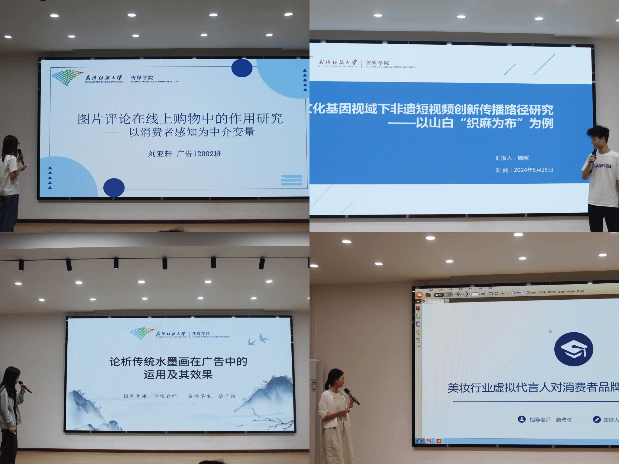 广告12001班周煊以山白“织麻为布”为例,阐述研究文化基因视域下非遗短视频创新传播路径;广告12001班柯芮创新性地提出烘焙糕点平面广告中“国潮元素”对消费者购买意愿的影响;广告12002班刘亚轩以消费者感知为中介变量,偏重研究图片评论在线上购物中的作用;广告12002班刘娟通过消费者意愿研究美妆行业虚拟代言人对消费者品牌态度的影响;广告12002班蔡子怡论析传统水墨画在广告中的运用及其效果,赋予传统文化新的活力。