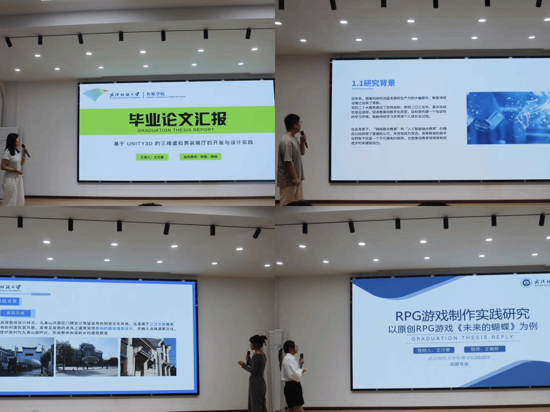 数媒12001班刘乾以可视化数字教学在信息可视化课程中的研究与实践为题,充分阐释了教学相长的可行性;数媒12002班王文馨基于Unity3D的三维虚拟技术,研究男装展厅的开发与设计实践效果;数媒12001班施菲婷基于增强现实的目的,研究炉房村旧居改造数字沙盘设计;动画12001班王琇萱讲述了游戏设计《未来的蝴蝶》蓝图,展现了游戏设计的更多可能性。