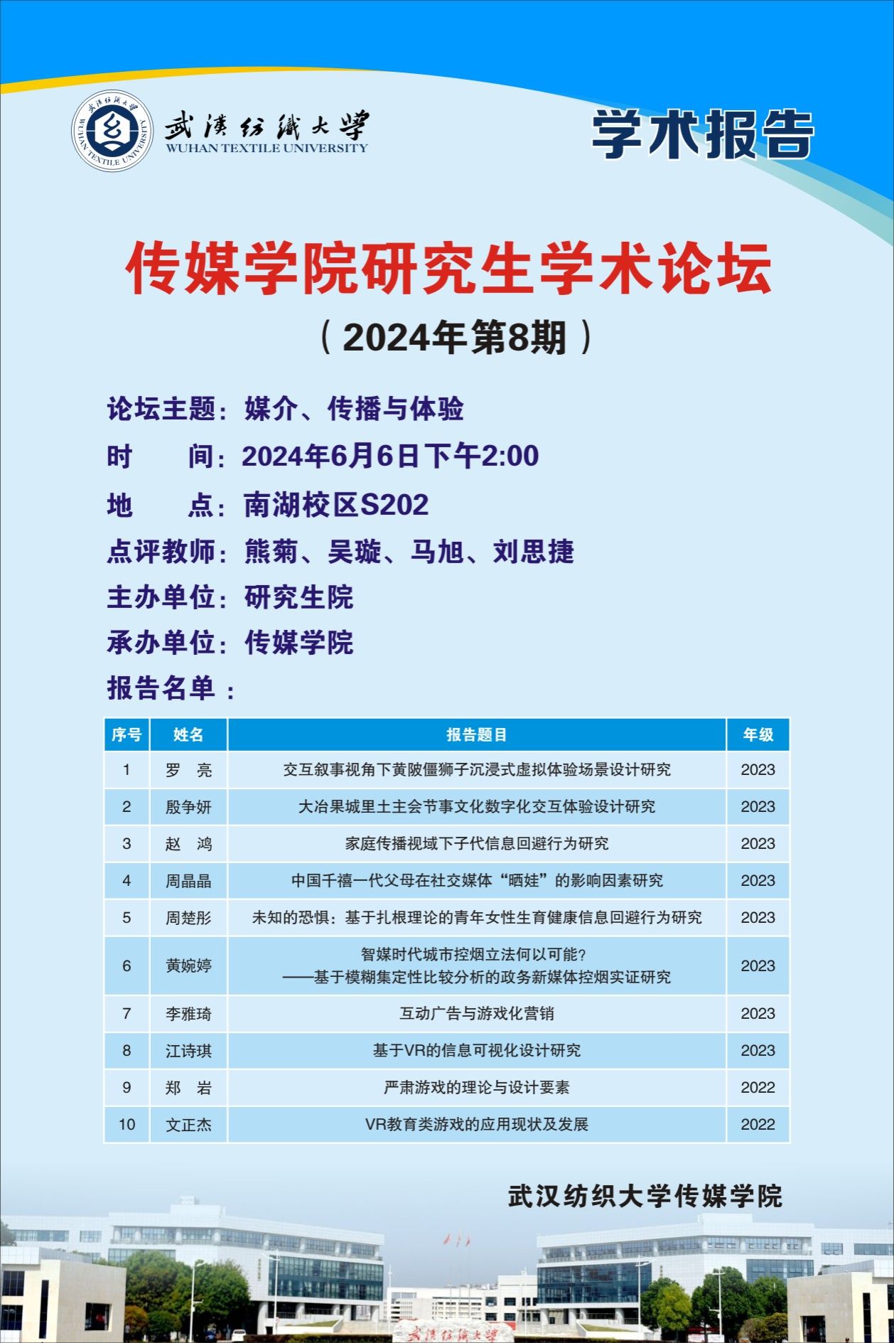 为进一步提升研究生学术素养,促进不同专业研究生的思想交流,6月6日下午,伟德国际1946bv官网举办以“媒介、传播与体验”为主题的2024年第8期研究生学术论坛。伟德国际1946bv官网硕士研究生导师熊菊、吴璇、马旭、刘思捷参加本次论坛,来自设计学、新闻与传播、广播电视专业的10名研究生针对自己的研究选题和研究问题展开具体分析与交流。